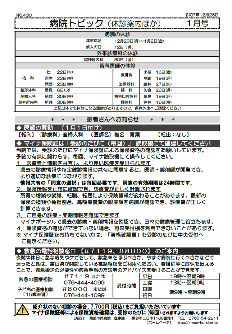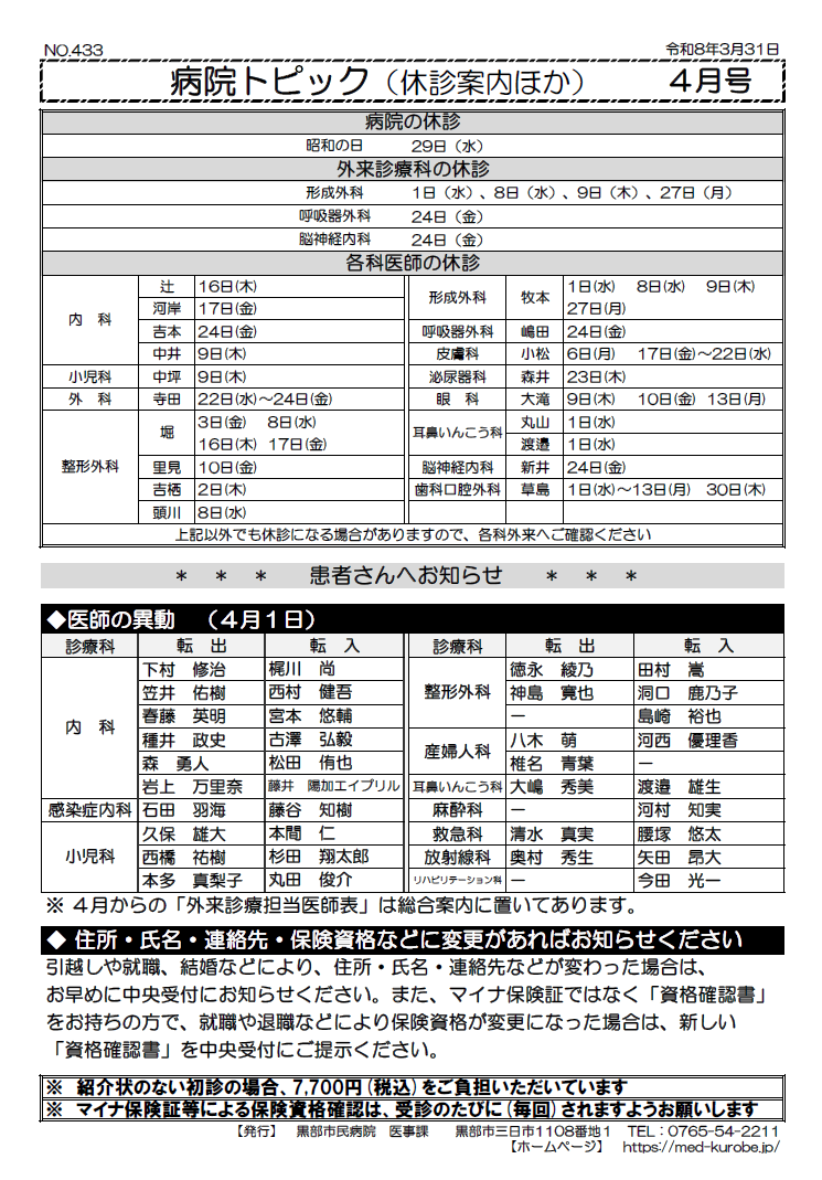 病院だよりは患者さん向けの広報誌で、休診案内や受診時の留意点などを掲載しています。黒部市民病院に通院されている方、または受診しようとされる方はご一読いただければと思います(令和6年4月から広報誌名を病院だよりから病院トピックに変更)
