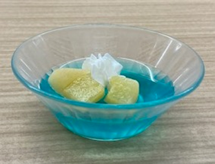 世界糖尿病デーの日の昼食に糖尿病のイメージカラーであるブルーで色付けされた低カロリーデザートを入院患者さんに提供しています。当院栄養科のオリジナルデザートです。
