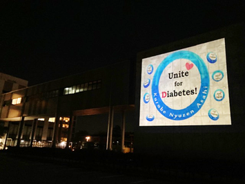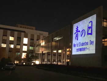 世界糖尿病デーの日は全世界の名所がブルーにライトアップされます。 当院では黒部市民病院の壁をスクリーン代わりにして糖尿病に関するスライドを映写します。市民の方々に糖尿病チームの活動や糖尿病について知っていただくよい機会となります。