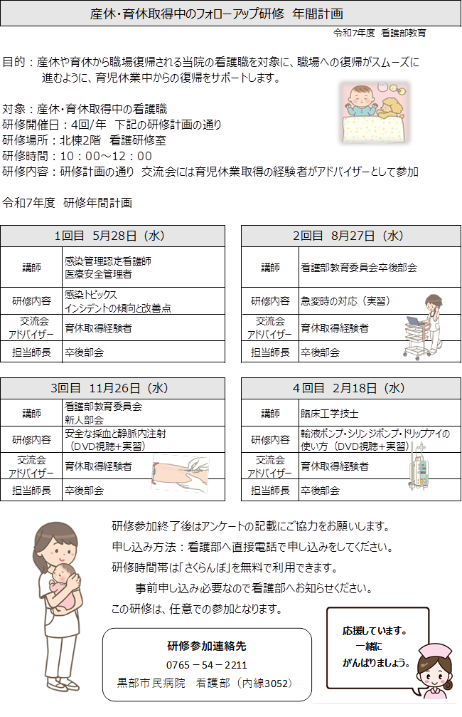産休や育休から職場復帰する当院の看護師を対象として、職場への復帰がスムーズに進むように育児休業からの復帰をサポートする。