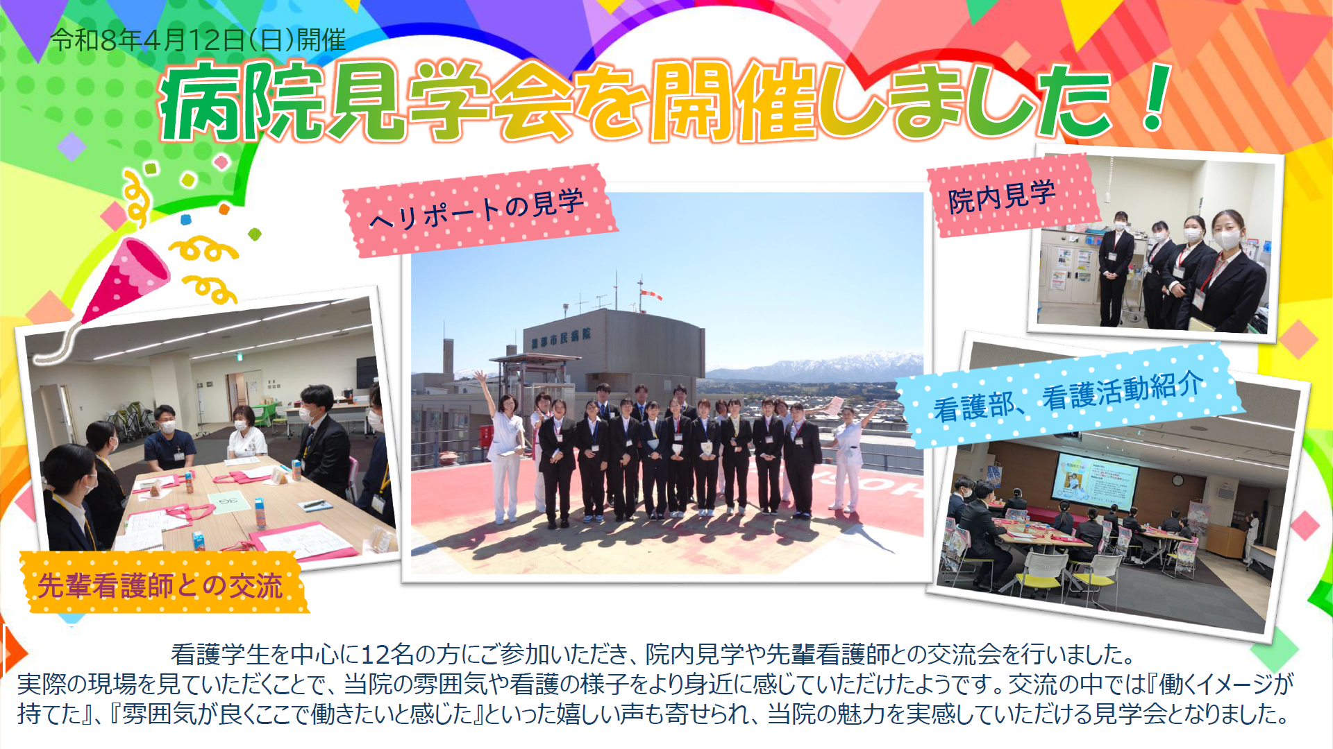 院内見学や先輩看護師との交流を通して、当院の雰囲気や看護の実際を知っていただく良い機会となりました。