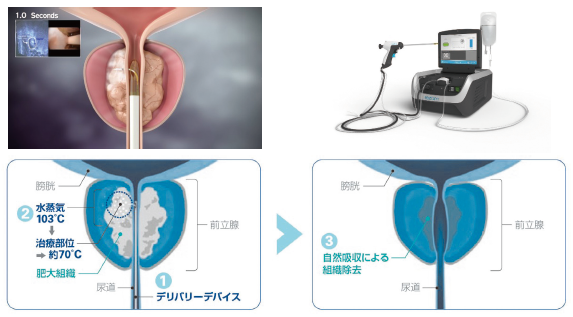 この度、当院でも前立腺肥大症に対するRezum システムによる水蒸気治療を導入いたしました。Rezumシステムは前立腺肥大症に対する手術方法のひとつで、水蒸気が肥大した前立腺組織内に蔓延し、細胞を壊し、1-3 か月かけてその細胞が体内に吸収されていくことで、前立腺肥大症に伴う症状を緩和します。日本では行政の承認を2021 年に取得しましたが、欧米では5 年以上の実績があり、治療の安全性、有効性が示されています。