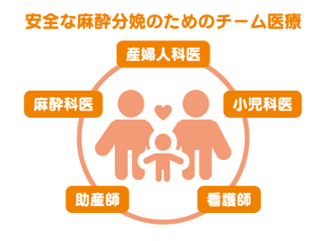 安全な麻酔分娩を提供するためにはこの産婦人科医、麻酔科医、小児科医、助産師、看護師のチーム医療が重要となってきます。ハイリスク妊産婦、新生児に対応できるよう多職種が連携し母子に安心・安全な医療を提供できるよう医療体制を整えています。
