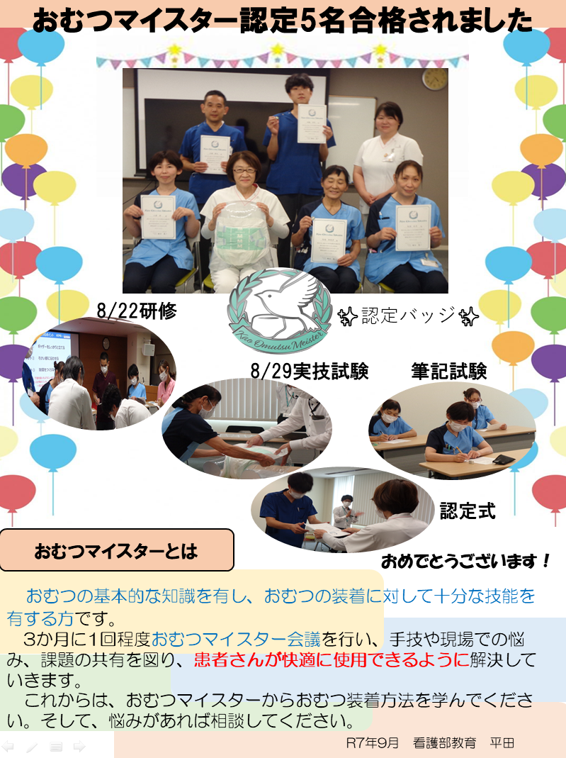 2025年8月29日、当院の介護福祉士5名が「おむつマイスター」の認定を取得いたしました。