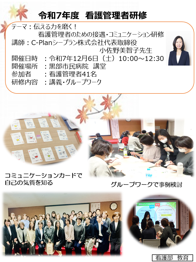 令和7年12月6日(土)に、黒部市民病院 講堂において、「伝える力を磨く!看護管理者のための接遇・コミュニケーション研修」をテーマに、小佐野美智子先生を講師にお迎えし、看護管理者研修が開催されました。